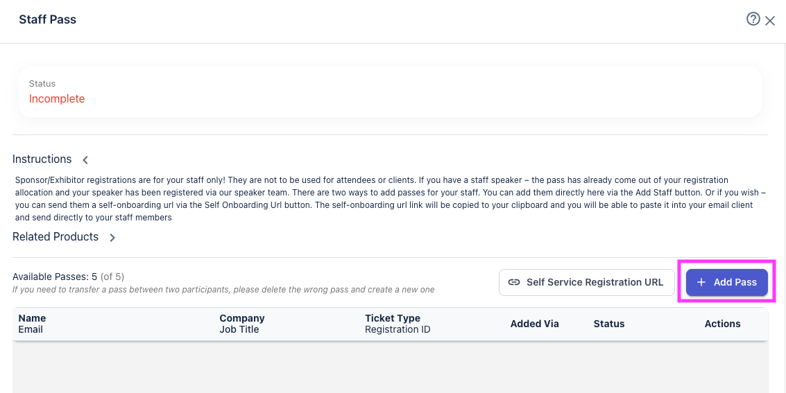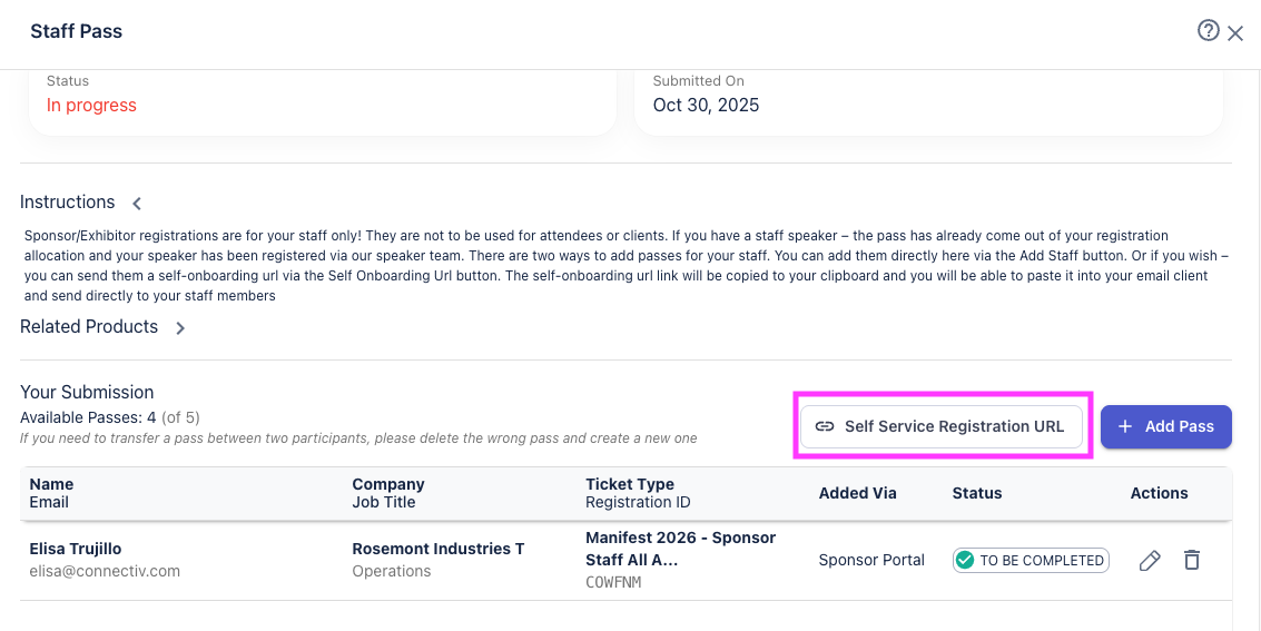For both client and staff passes, you have 2 options. You can either 1) Fill out the attendee information yourself manually or 2) Use the Self Service Registration URL.